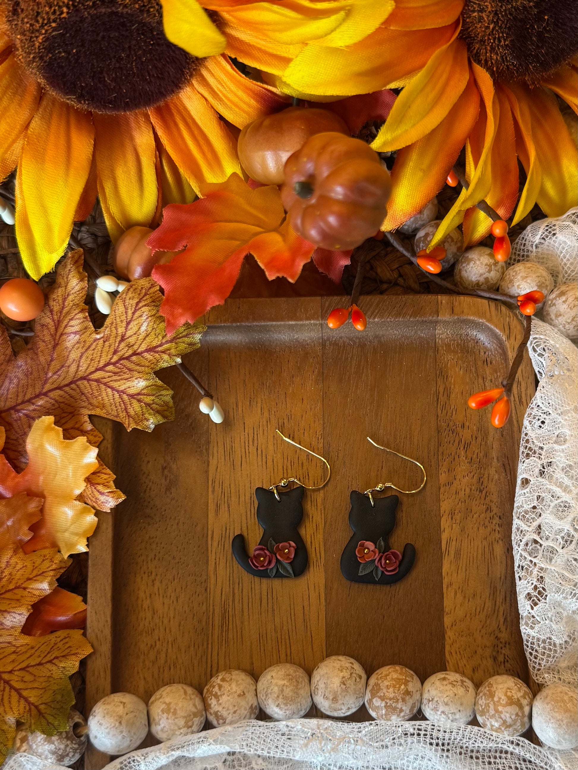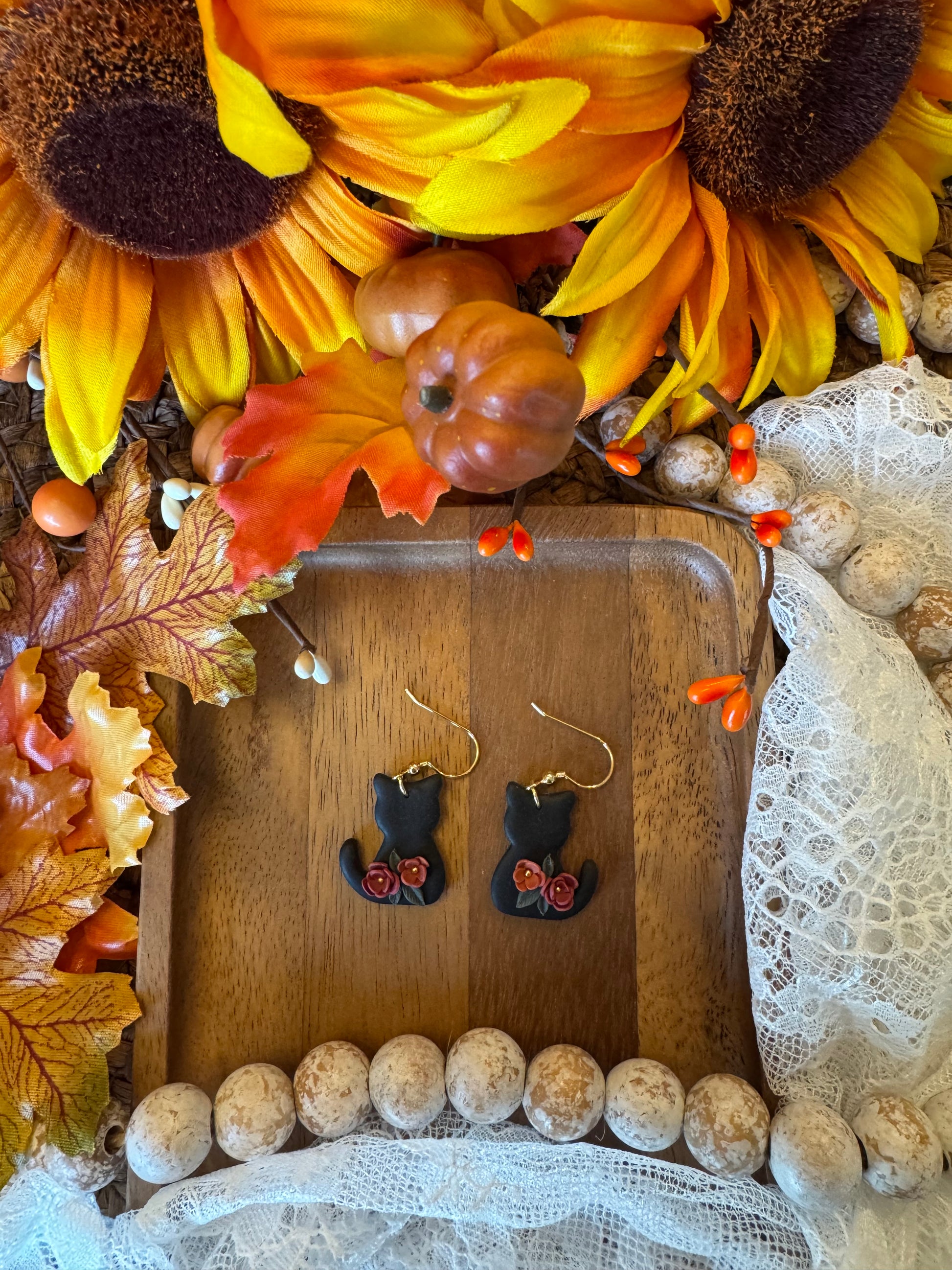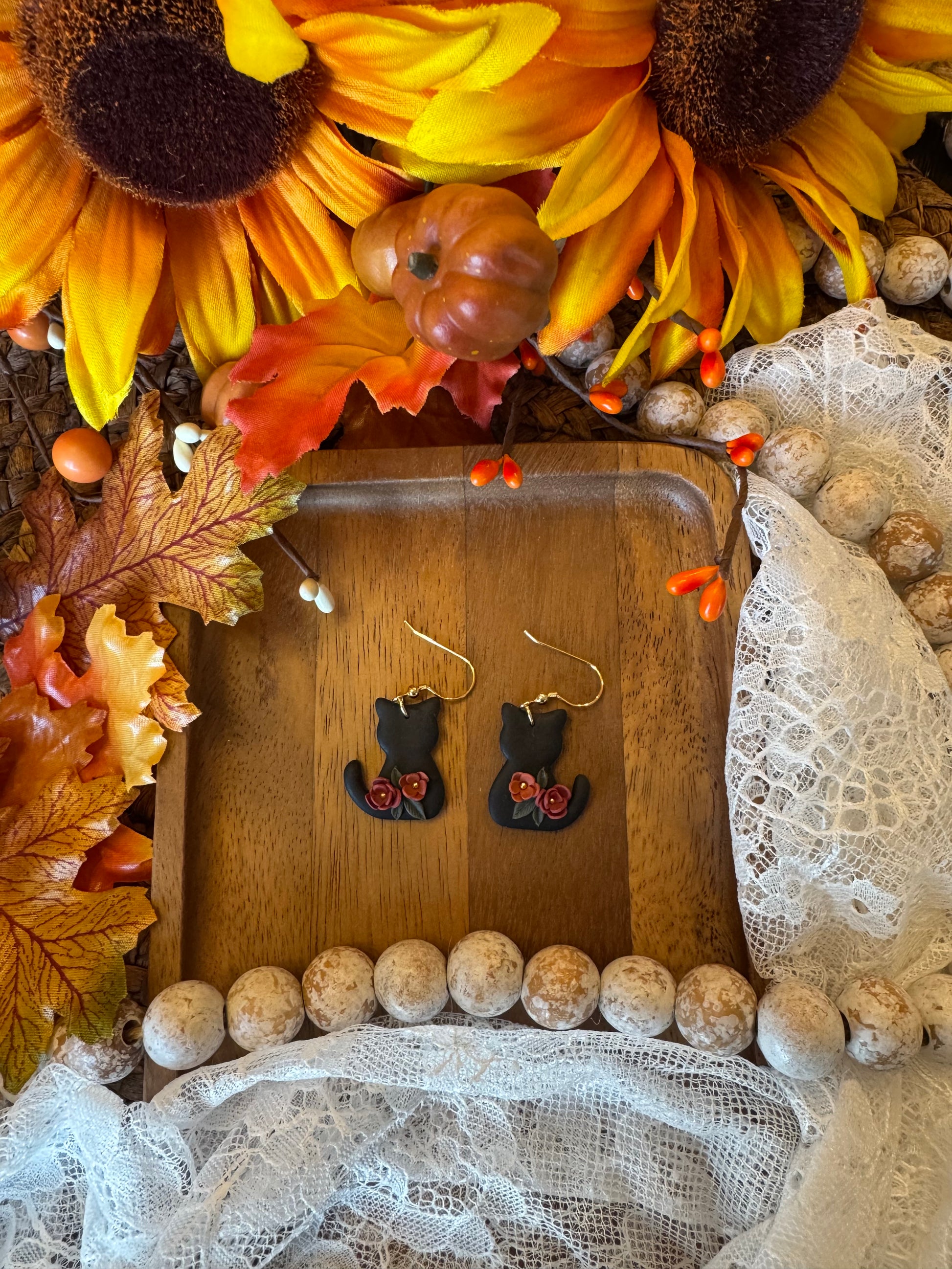 Handmade, lightweight polymer clay earrings featuring black cats and Fall colored flowers.