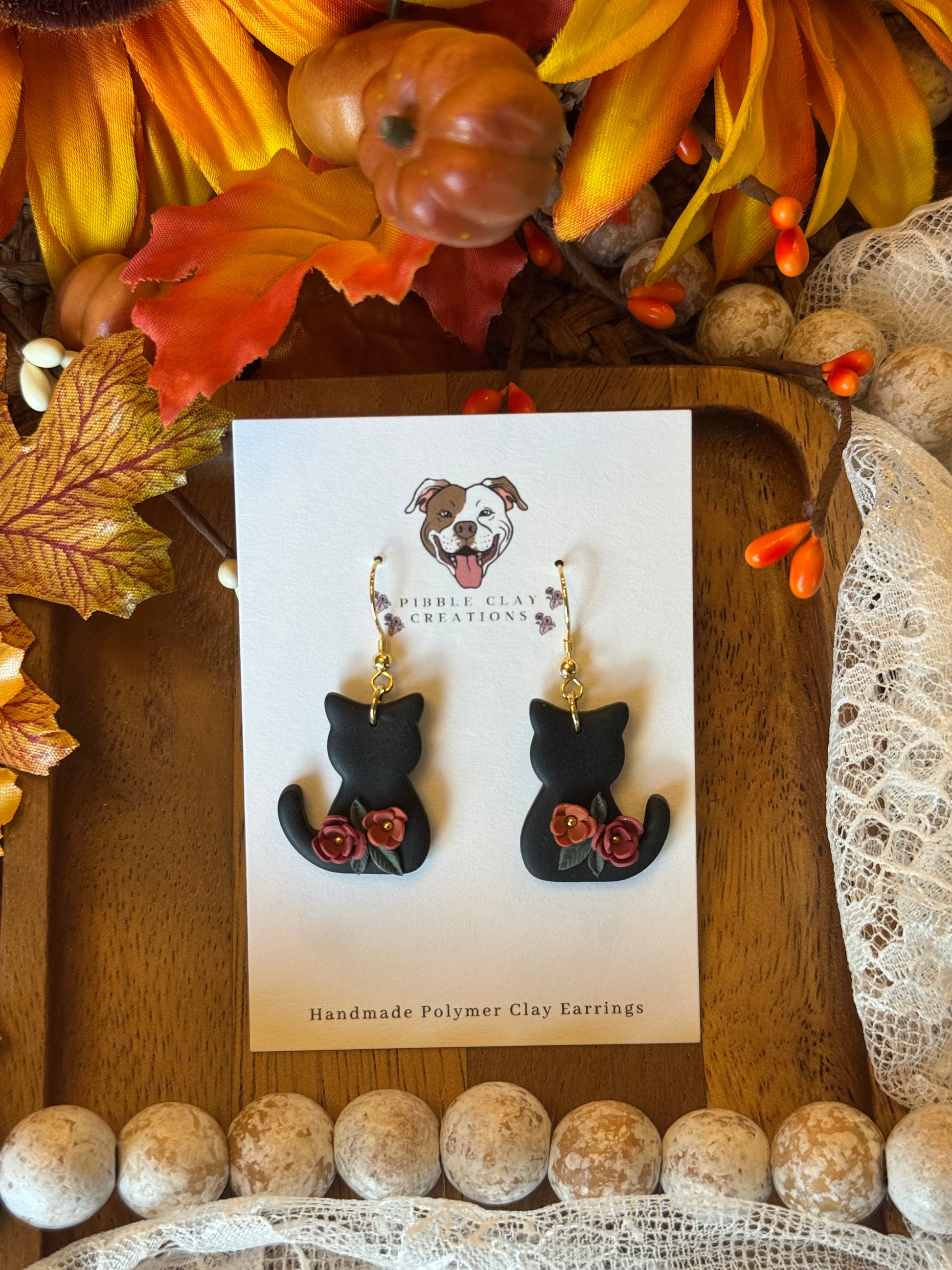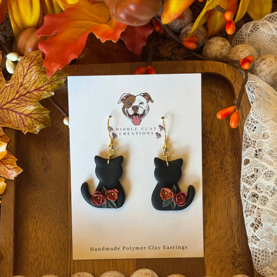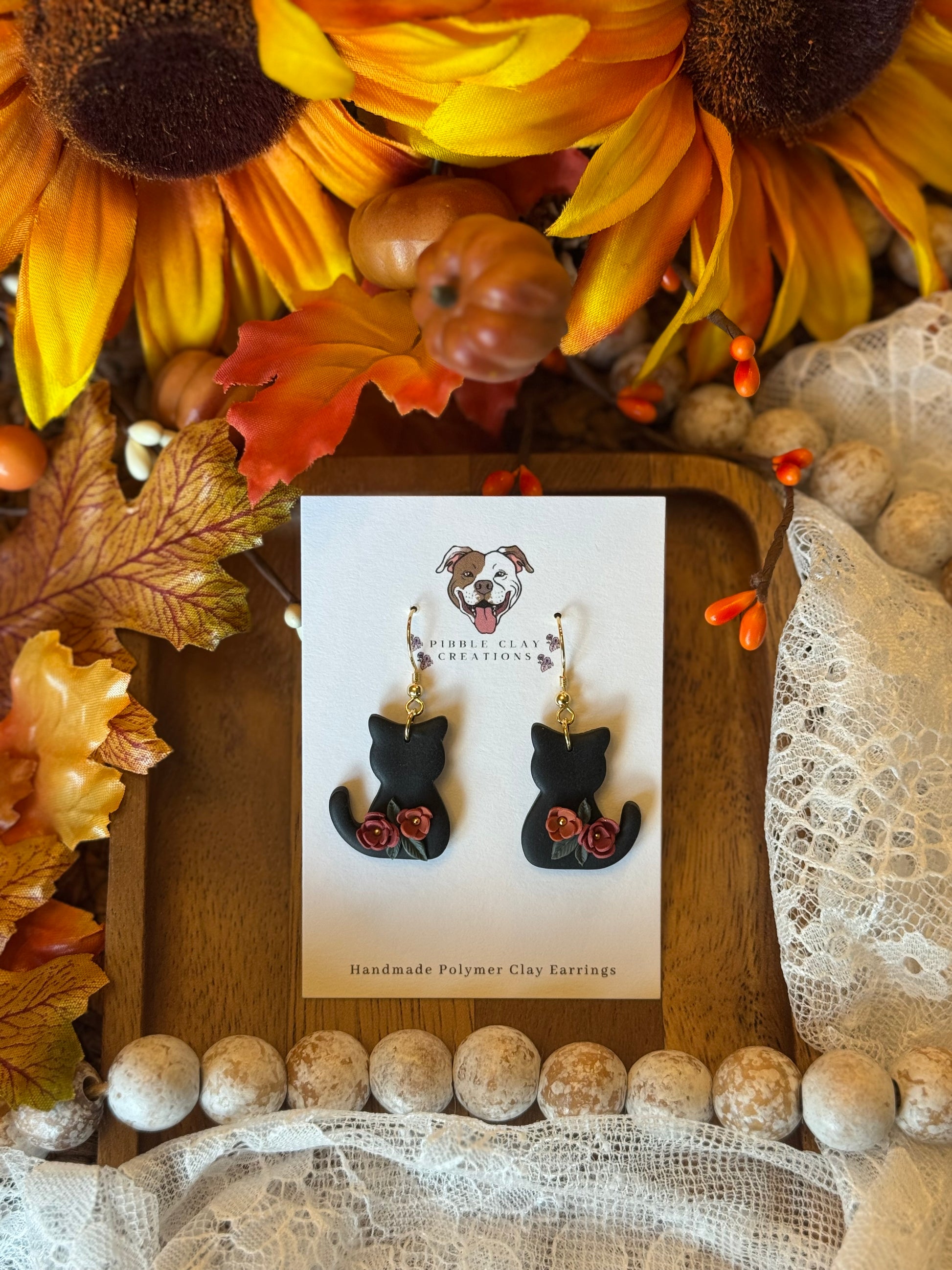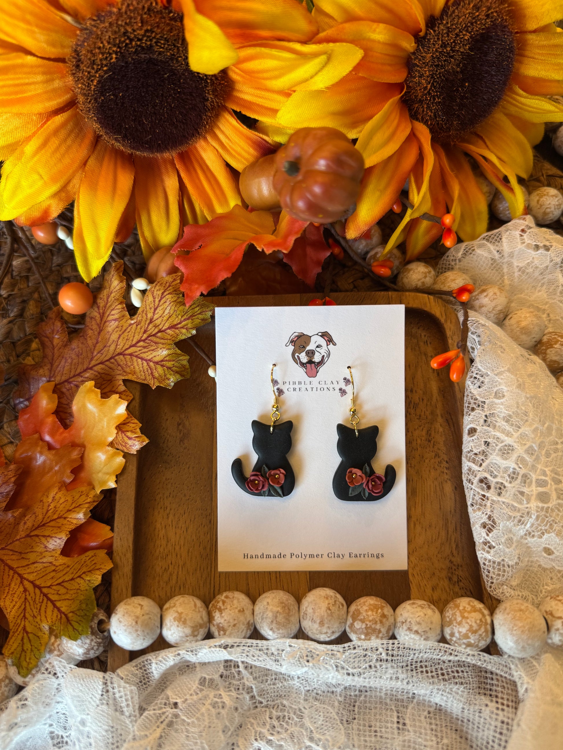 Handmade, lightweight polymer clay earrings featuring black cats and Fall colored flowers.