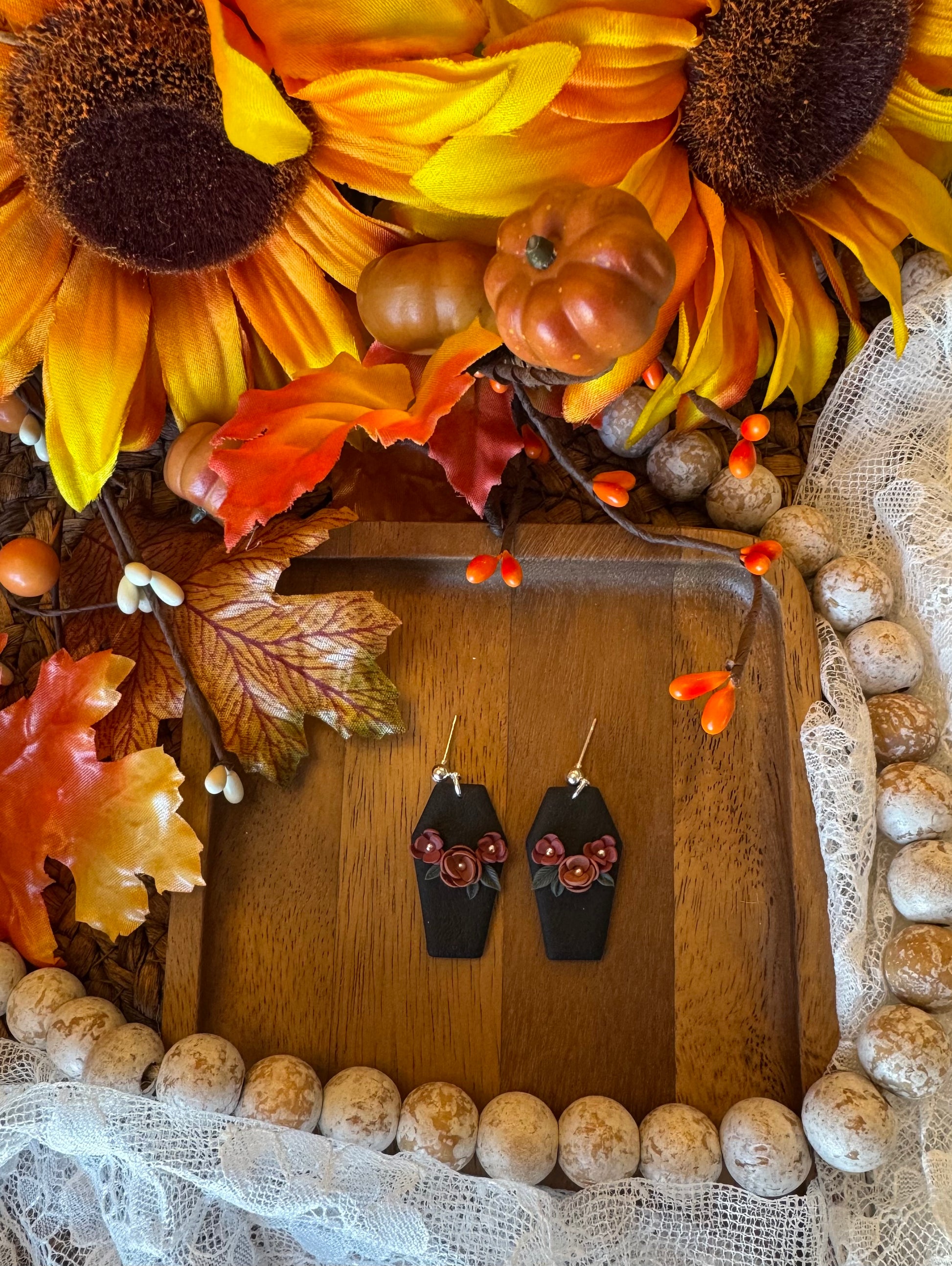 Handmade, lightweight polymer clay earrings featuring coffins with flowers.
