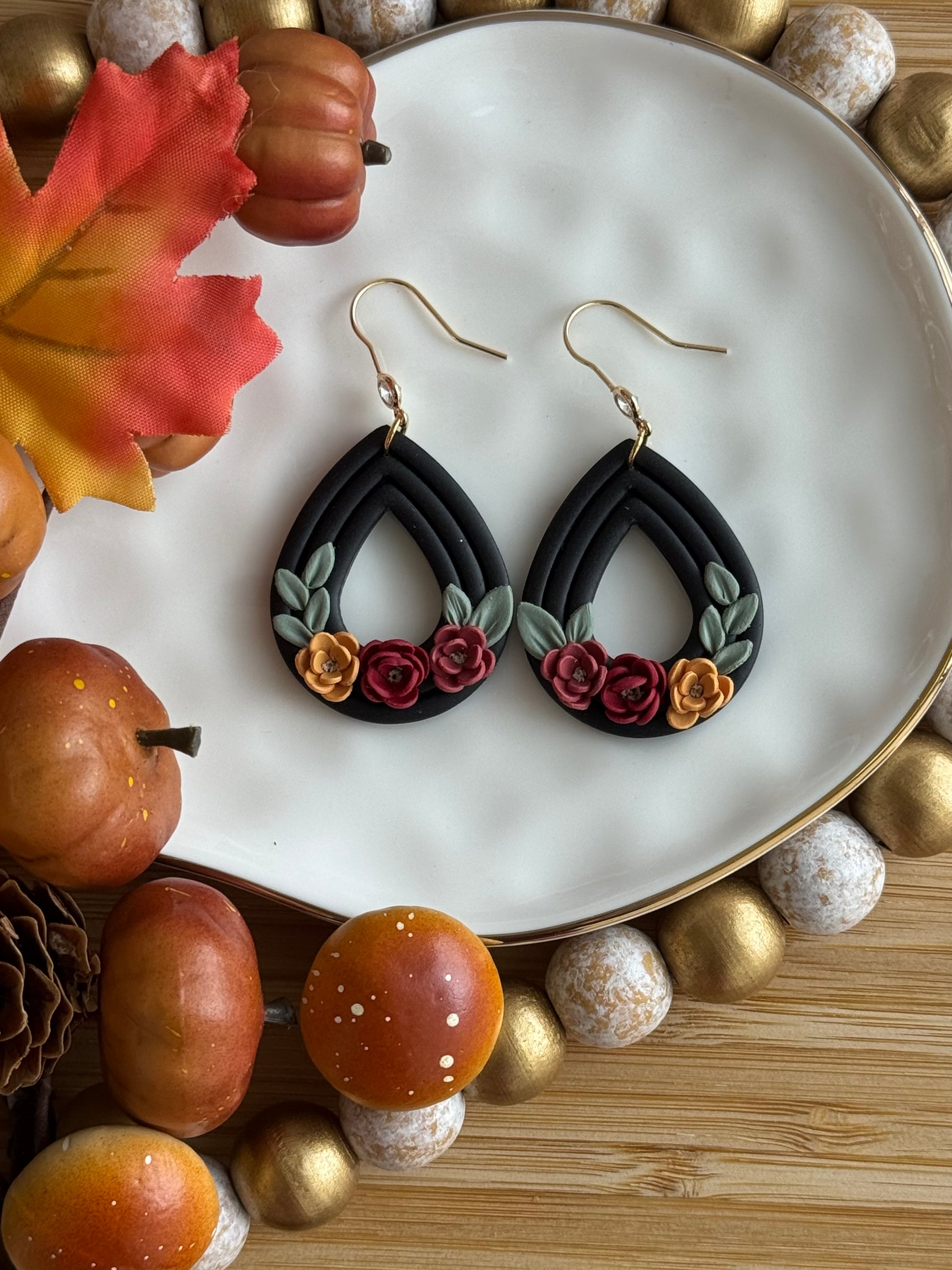 Handmade polymer clay earrings featuring a teardrop design with flowers.