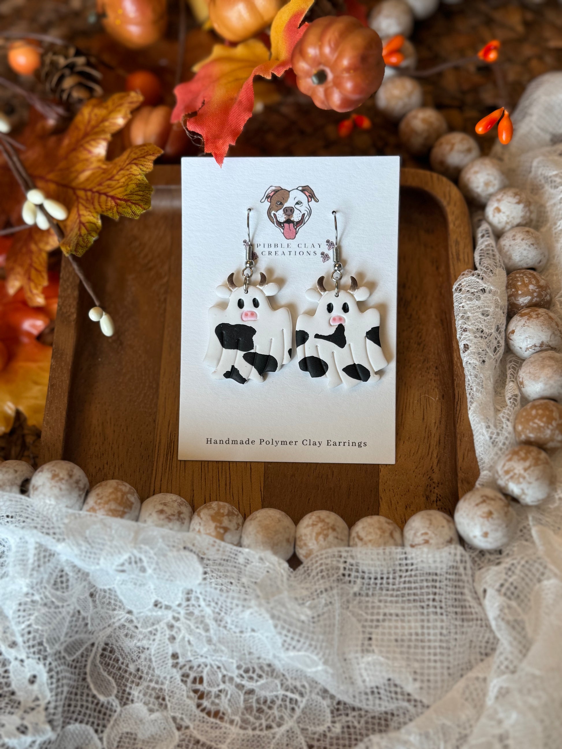 Handmade, lightweight polymer clay earrings featuring ghost cows.