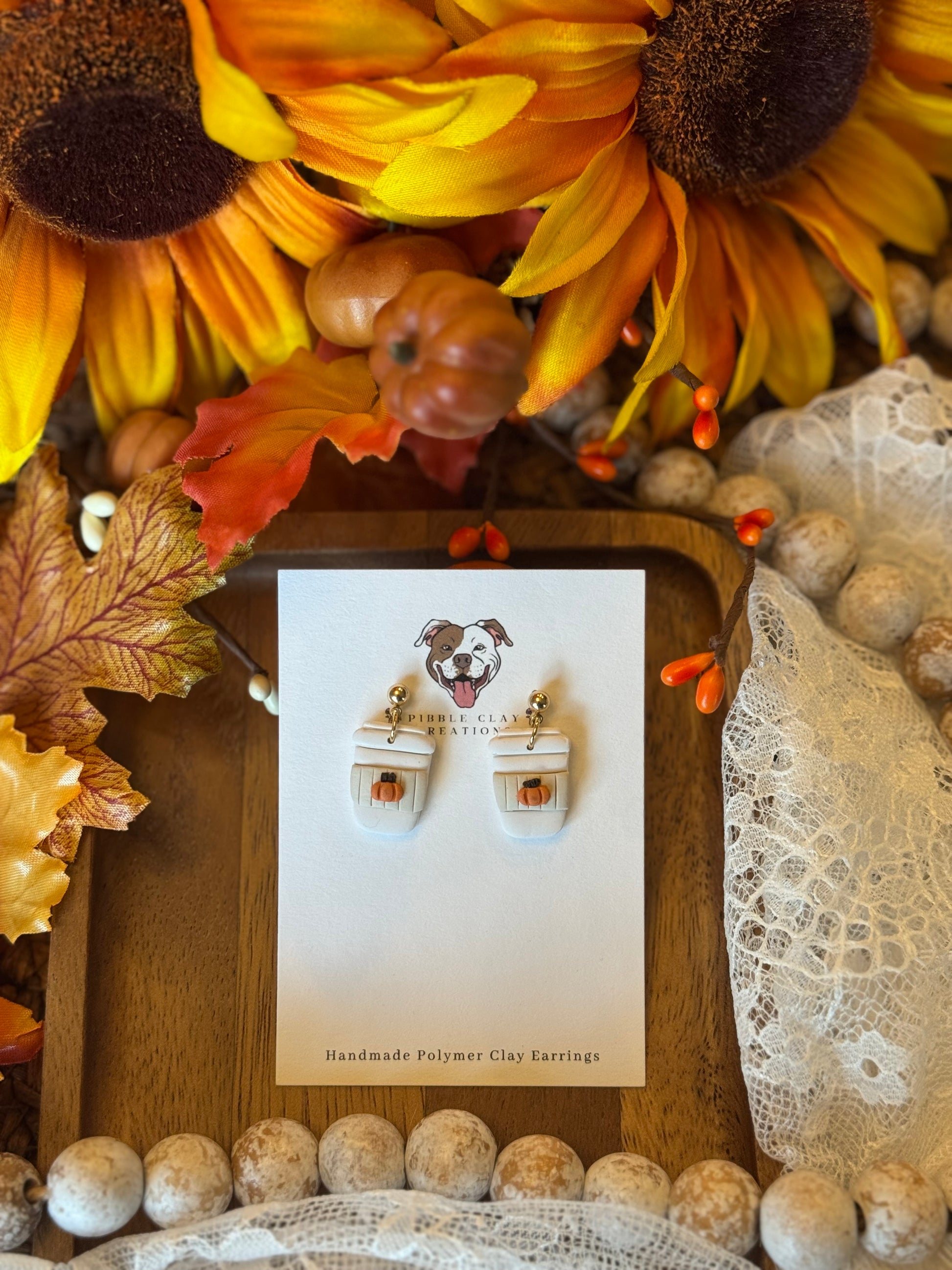Handmade, lightweight polymer clay pumpkin spice latte earrings.