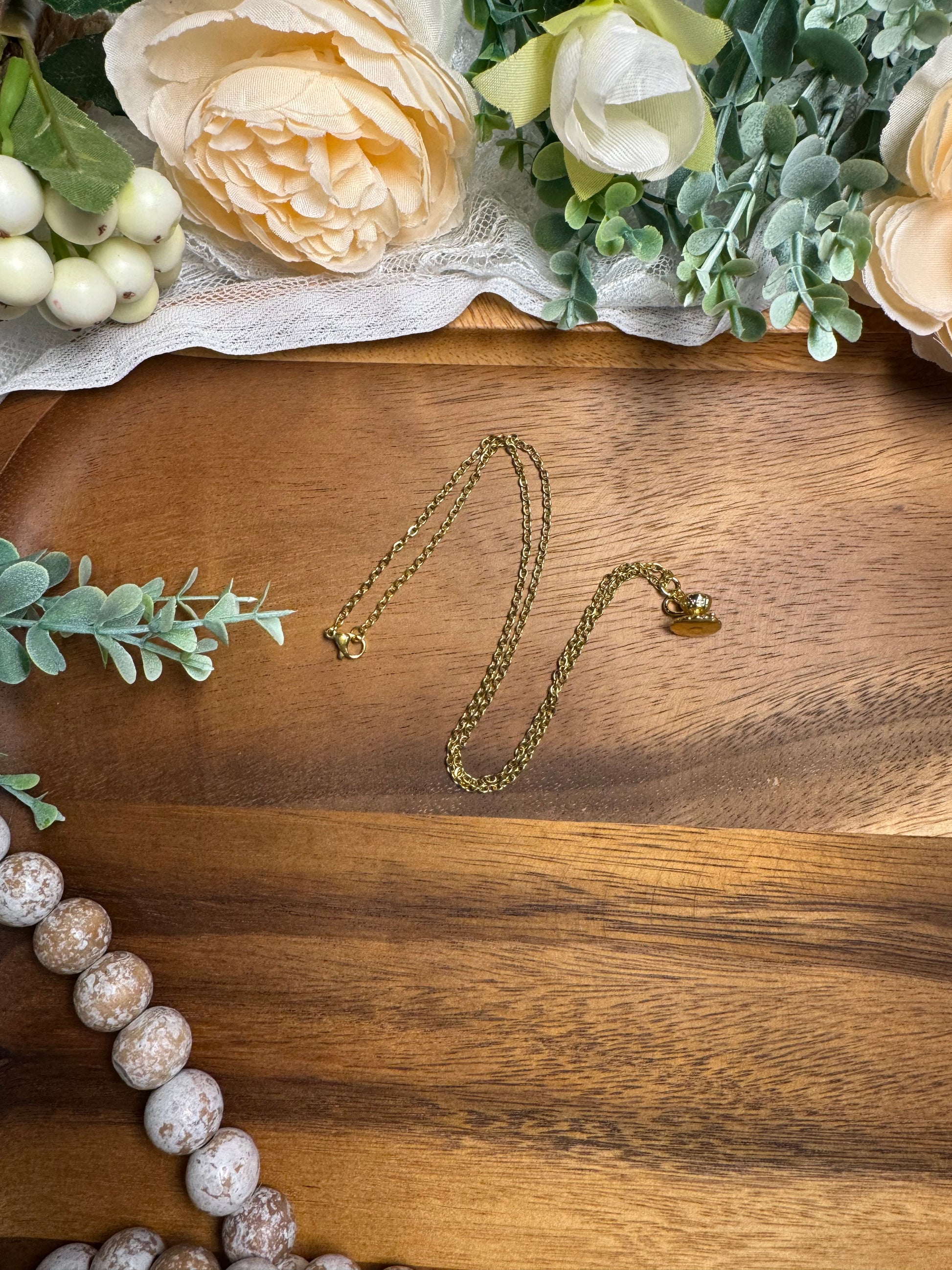 This necklace features a tea cup charm on an 18” gold plated stainless steel chain.