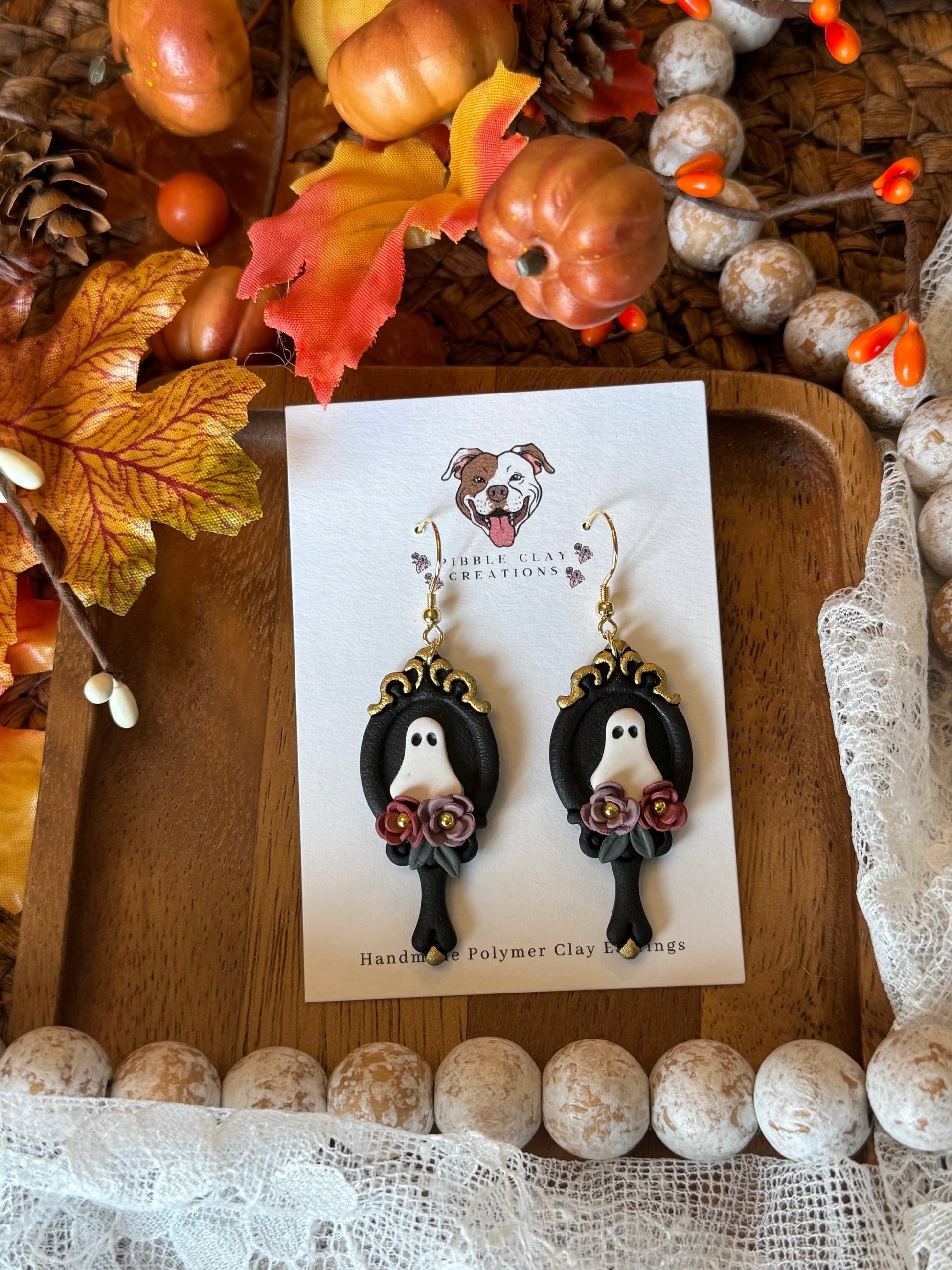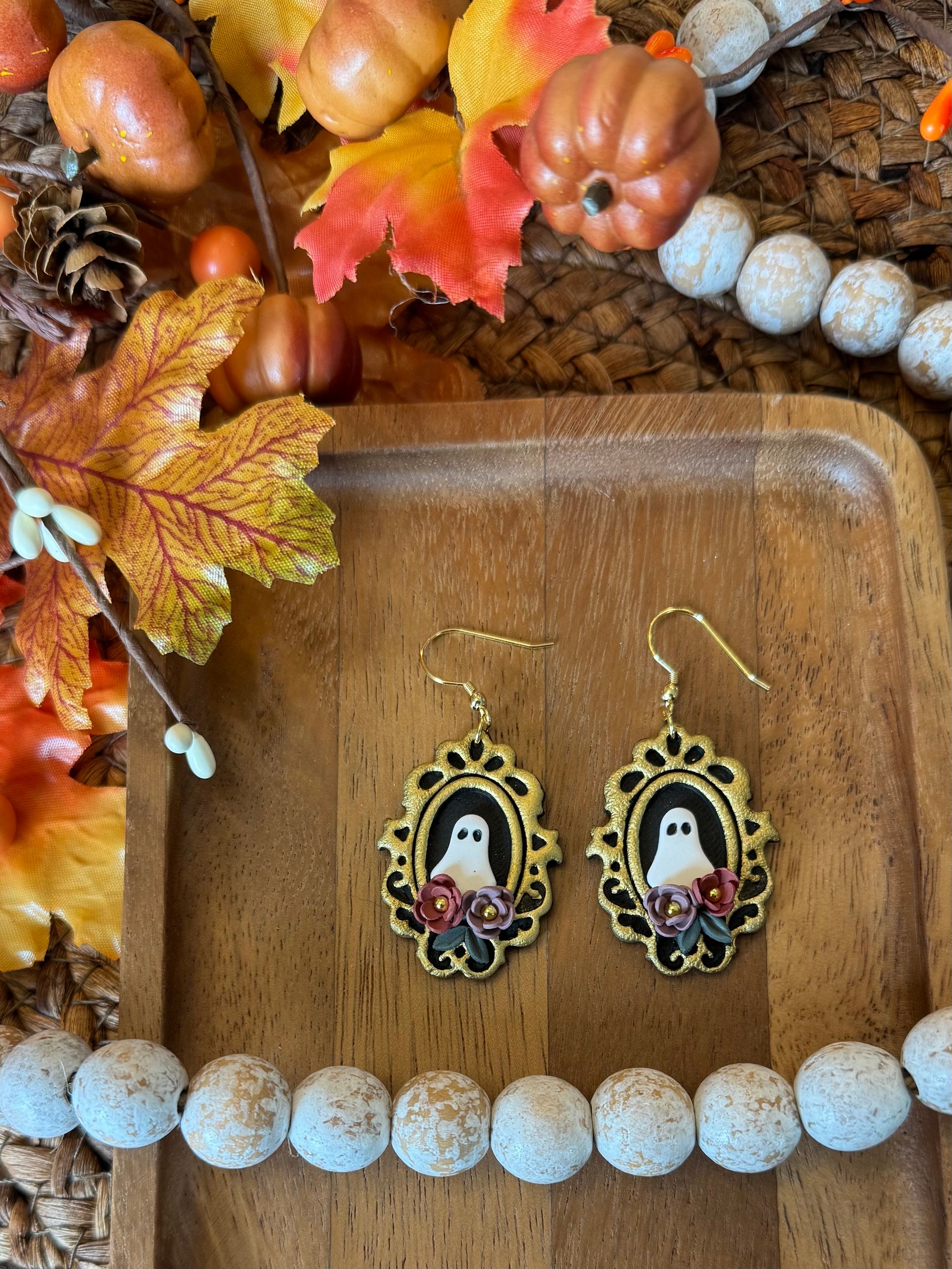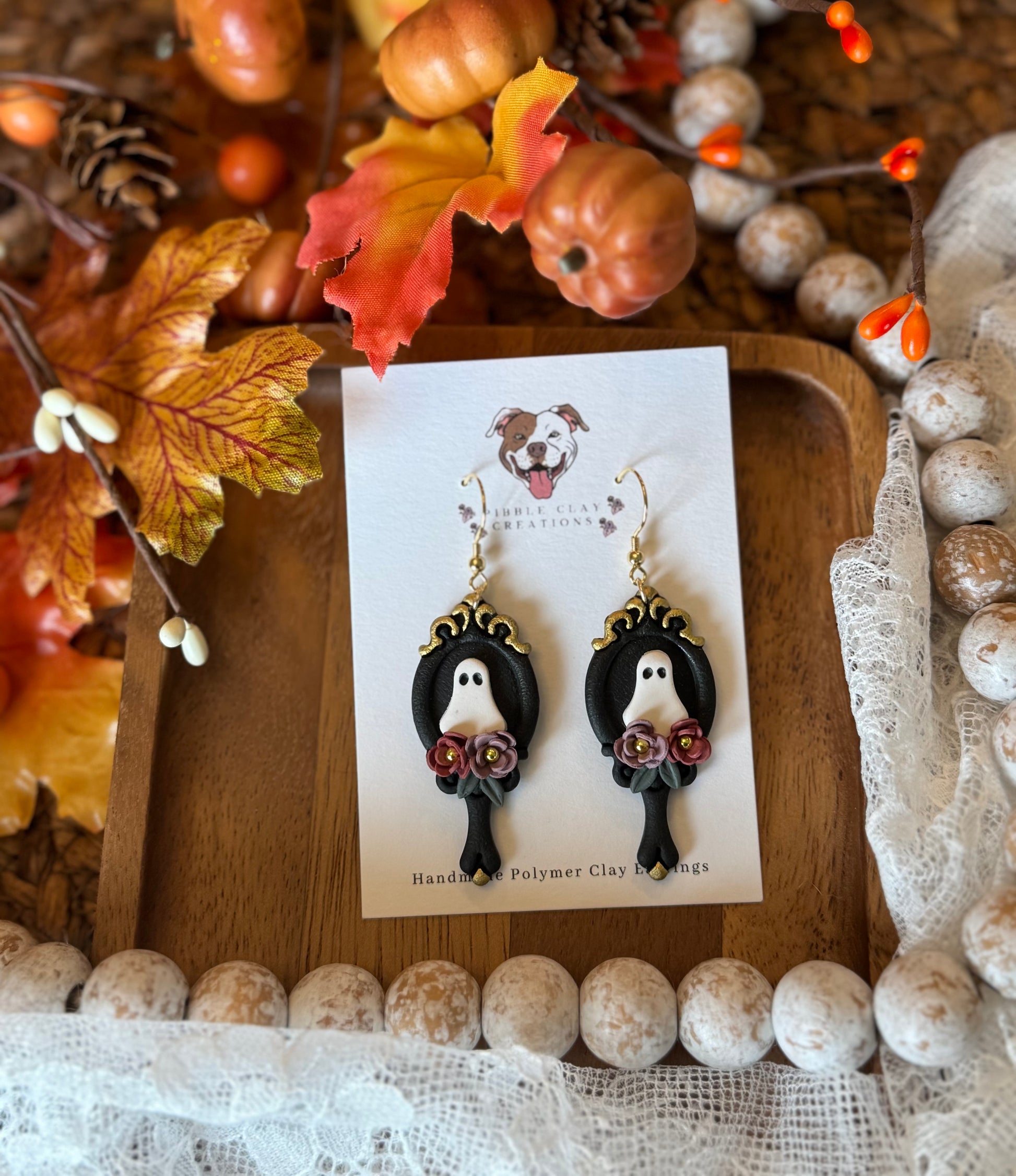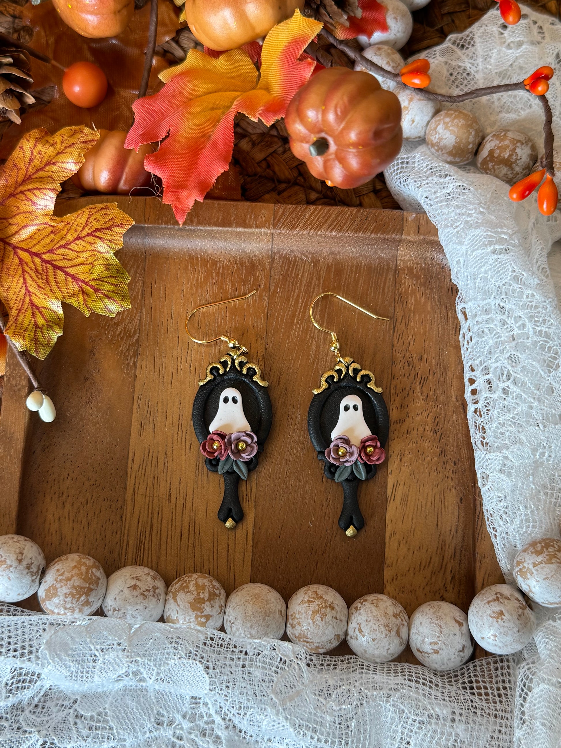Handmade, lightweight polymer clay earrings featuring vintage frames with flowers and ghosts.